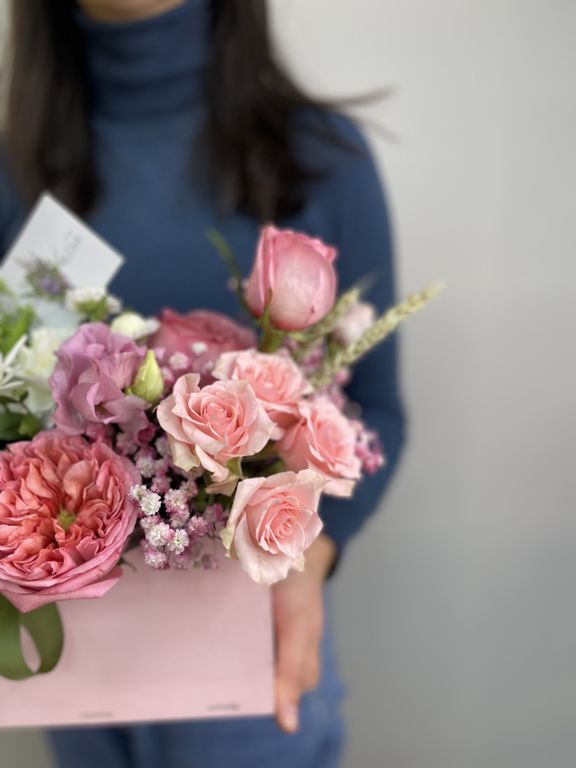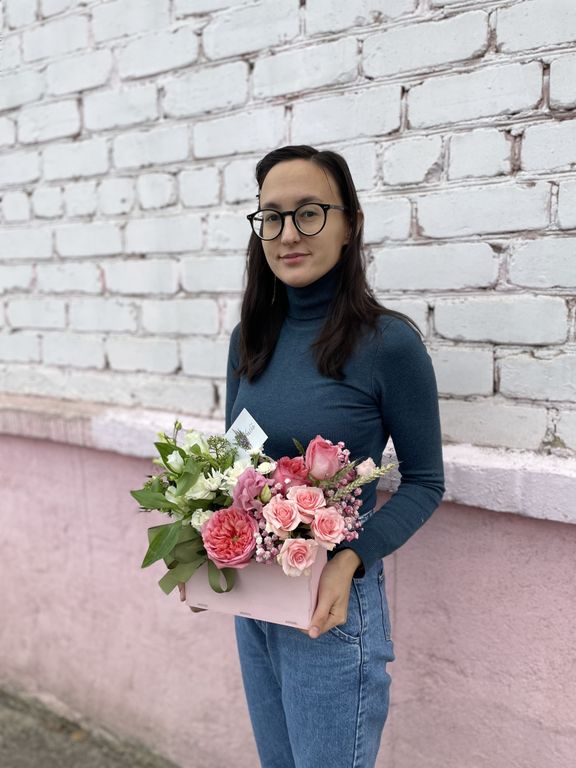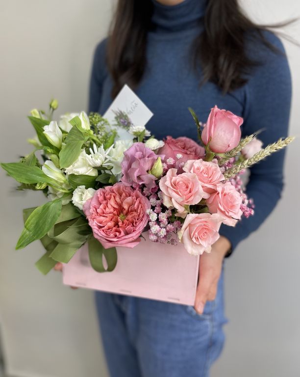 Нежная композиция в деревянном кашпо в виде конверта с пионовидными и кустовыми розами. Присутствие тонкого цветового контраста благодаря розовой гипсофиле и цветам эустомы и альстромерии придает особый характер композиции. (цвет ящика может отличаться)