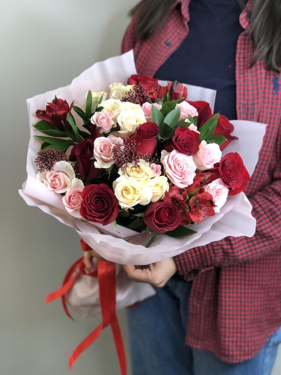 Букет "Теплые чувства" 6 800 ₽ В корзину В корзину Роза красная 9 шт. Роза кустовая 6 шт. Альстромерия 3 шт. Скимия 1 ветка Рускус 5 шт. Упаковка Роза красная 9 шт. Роза кустовая 6 шт. Альстромерия 3 шт. Скимия 1 ветка Рускус 5 шт. Упаковка Поделиться