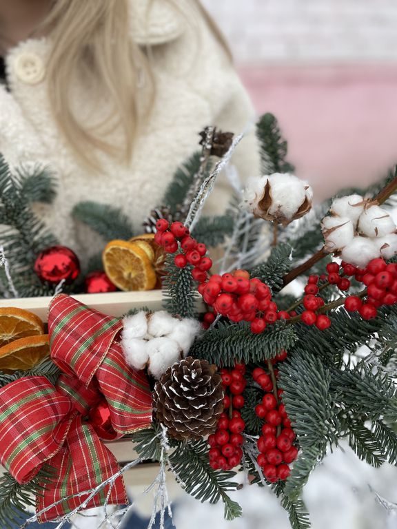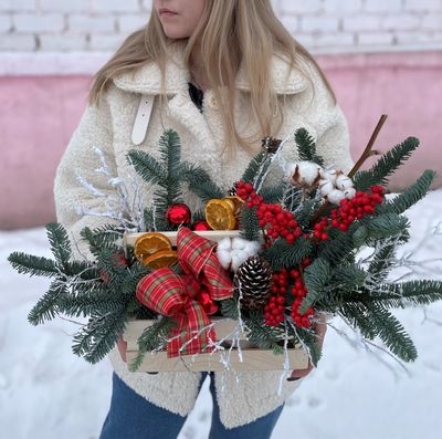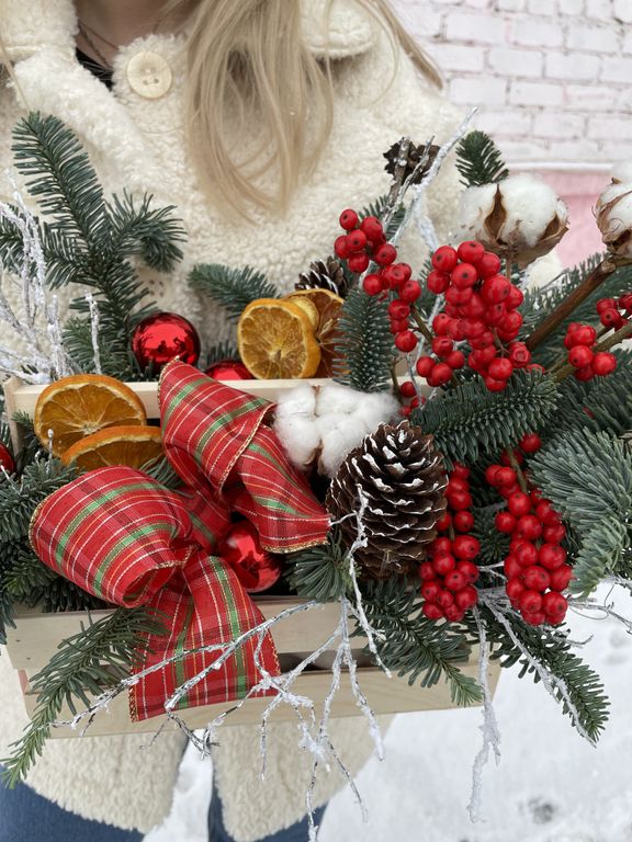 Композиция в ящике 2 200 ₽ В корзину В корзину Состав композиции:Ящик 1 шт. Оазис 1 шт. Илекс 0,5 ветки Нобилис 1 ветка Черничник 2 ветки Хлопок 3 шт. Шишки 2 шт. Елочные шарики 4 шт. Дольки апельсина 4 шт. Бант 1 шт. Время изготовления 2 часа Состав композиции:Ящик 1 шт. Оазис 1 шт. Илекс 0,5 ветки Нобилис 1 ветка Черничник 2 ветки Хлопок 3 шт. Шишки 2 шт. Елочные шарики 4 шт. Дольки апельсина 4 шт. Бант 1 шт. Время изготовления 2 часа Поделиться