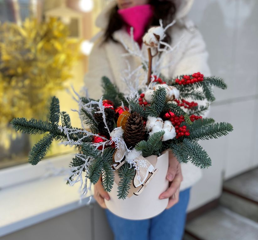 Новогодняя композиция с илексом и хлопком 2 100 ₽ В корзину В корзину Состав композиции:Шляпная корбка 1 шт. Оазис 1 шт. Нобилис 1 ветка Черничник 2 ветки Илекс 0,5 ветки Хлопок 4 шт. Долька апельсина 1 шт. Елочное украшение 1 шт. (может отличаться) Время изготовления композиции 2 часа Состав композиции:Шляпная корбка 1 шт. Оазис 1 шт. Нобилис 1 ветка Черничник 2 ветки Илекс 0,5 ветки Хлопок 4 шт. Долька апельсина 1 шт. Елочное украшение 1 шт. (может отличаться) Время изготовления композиции 2 часа Поделиться
