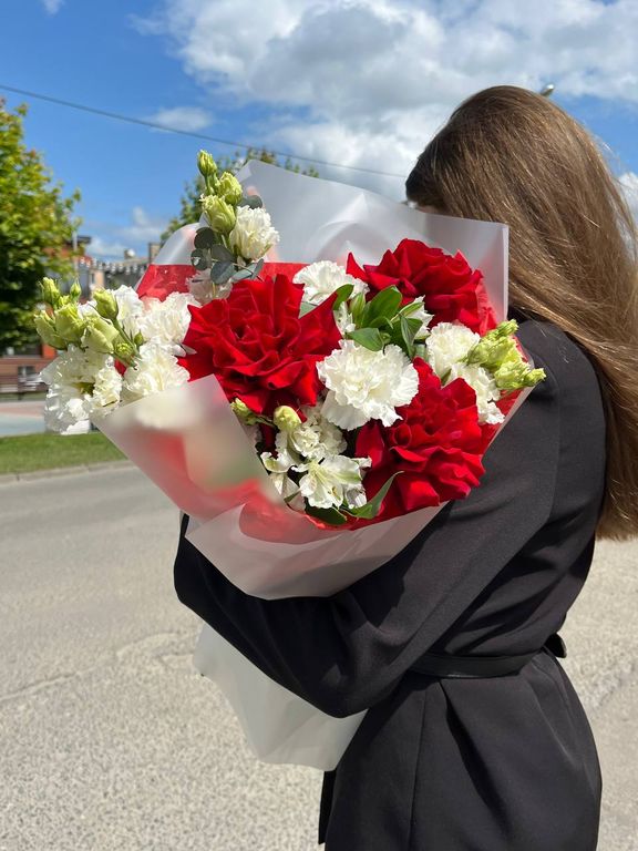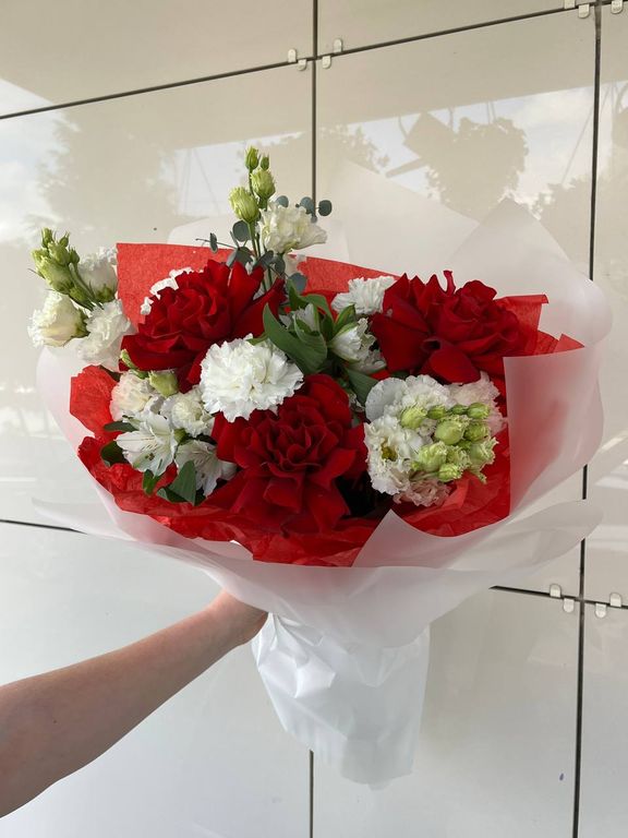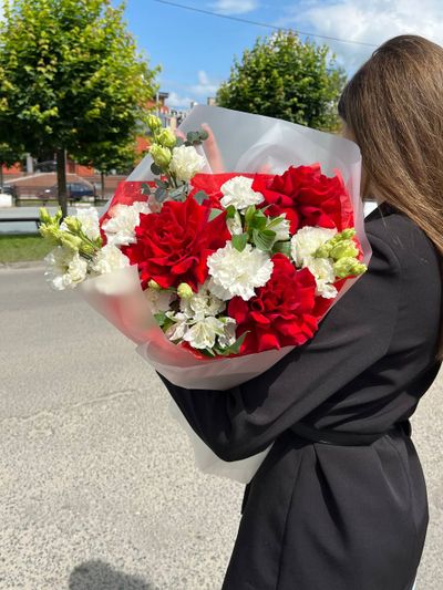 Невероятно сочный букет из алых ажурных эквадорских роз с огромным бутоном в обрамлении белых цветов гвоздики, эустомы и альстромерии. В современной упаковке сдержанных оттенков, дополняющих букет.