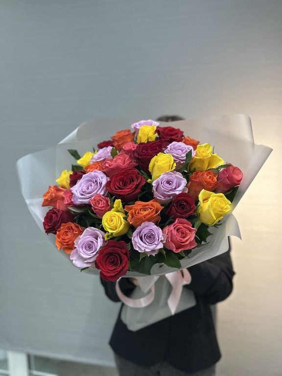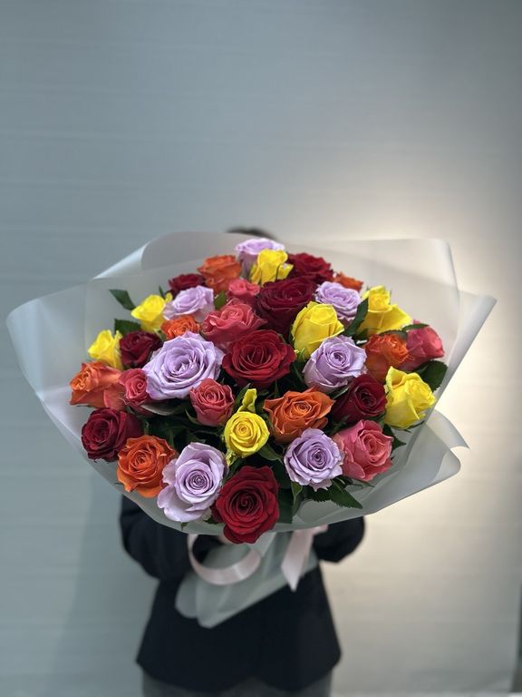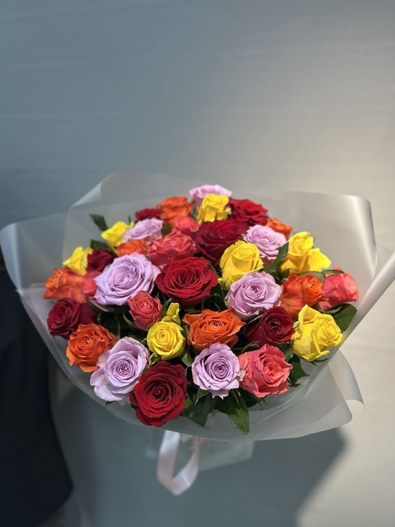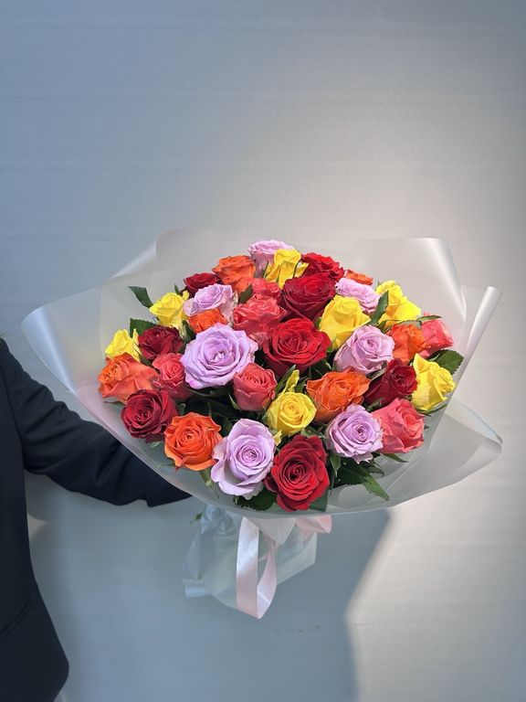 Букет из кенийских разноцветных роз 35 шт ( высота розы 40 см, размер бутона 2-3см)в классической упаковке. Цвет роз может отличаться с сохранением общей концепции и цветовой гаммы