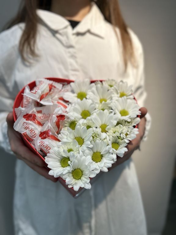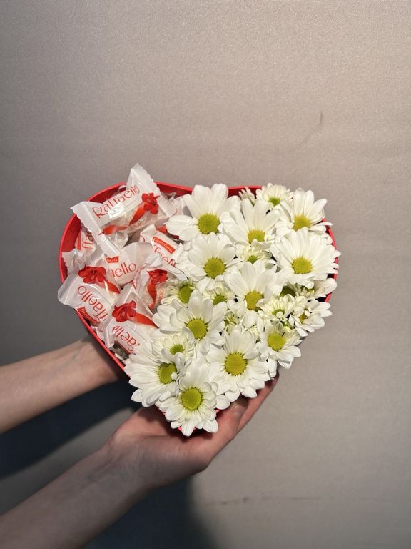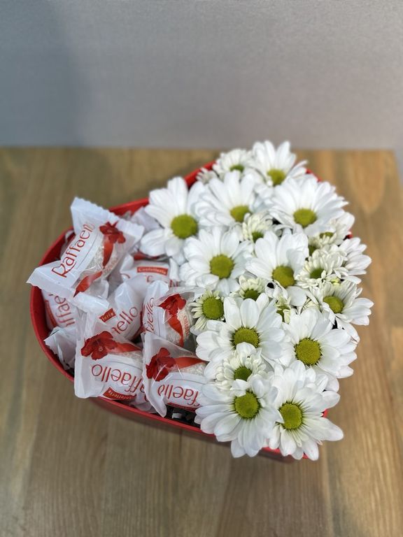 Композиция Мое Сердце 1 350 ₽ В корзину В корзину Композиция на флористической губке, сделанная в коробке в форме сердца из стойких ромашек-цветов хризантемы разного диаметра с конфетами рафаэлло(7 шт) Размер композиции диаметр 20-25 см высота до 10-12 см Композиция на флористической губке, сделанная в коробке в форме сердца из стойких ромашек-цветов хризантемы разного диаметра с конфетами рафаэлло(7 шт) Размер композиции диаметр 20-25 см высота до 10-12 см Поделиться
