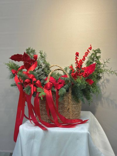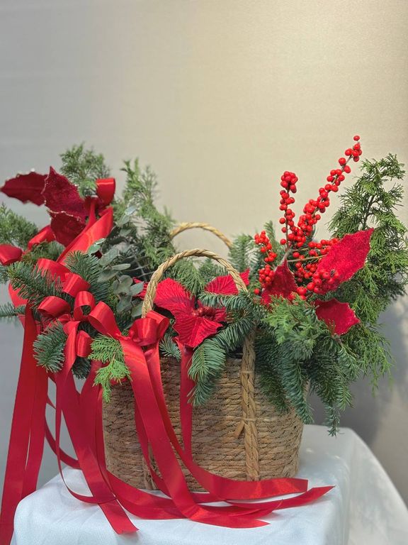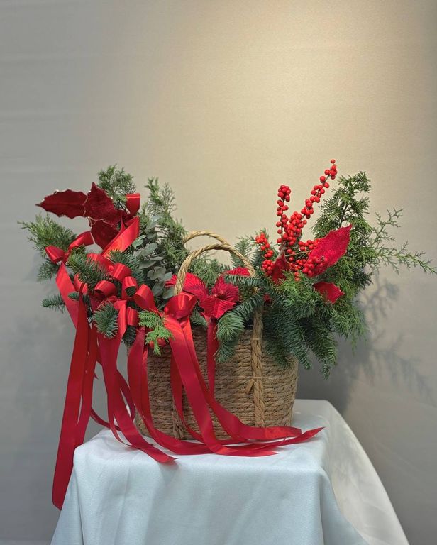 Композиция "Рождественский Уют" 4 000 ₽ В корзину В корзину Уютная новогодняя композиция в плетеной корзине (50х40 см). Нобилис, туя, эвкалипт, илекс, красные банты и декор создают атмосферу праздника. Идеальный подарок или украшение интерьера! Уютная новогодняя композиция в плетеной корзине (50х40 см). Нобилис, туя, эвкалипт, илекс, красные банты и декор создают атмосферу праздника. Идеальный подарок или украшение интерьера! Поделиться