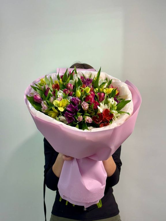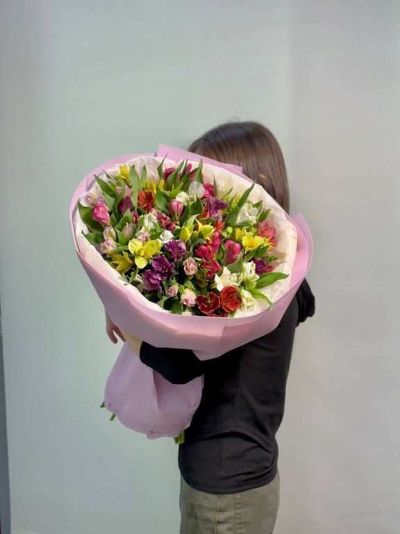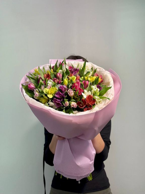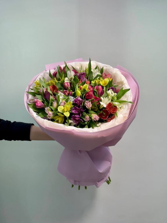 Примечание: Цветовая гамма альстромерий может варьироваться в зависимости от наличия, сохраняя общую концепцию яркости и объема.