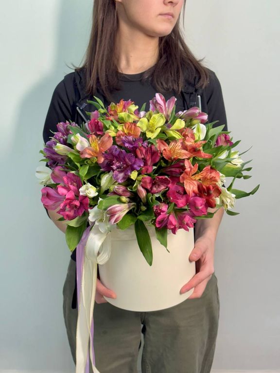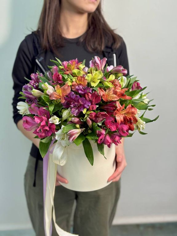 Элегантная композиция из 25 ярких и стойких альстромерий в стильной шляпной коробке. Это изысканный подарок, который подарит солнечное настроение и станет изюминкой любого интерьера.
