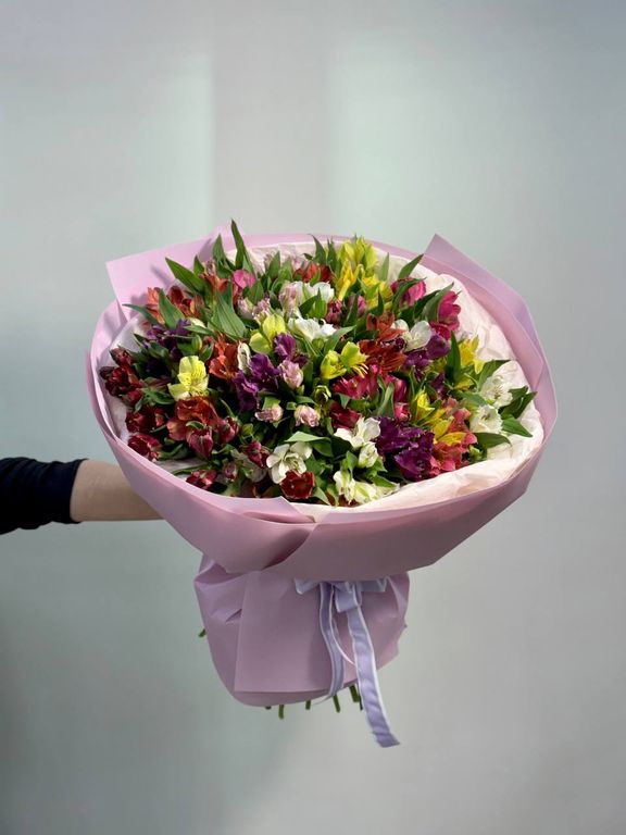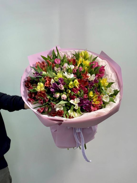 Примечание: Цветовая гамма альстромерий может варьироваться в зависимости от наличия, сохраняя общую концепцию яркости и объема.