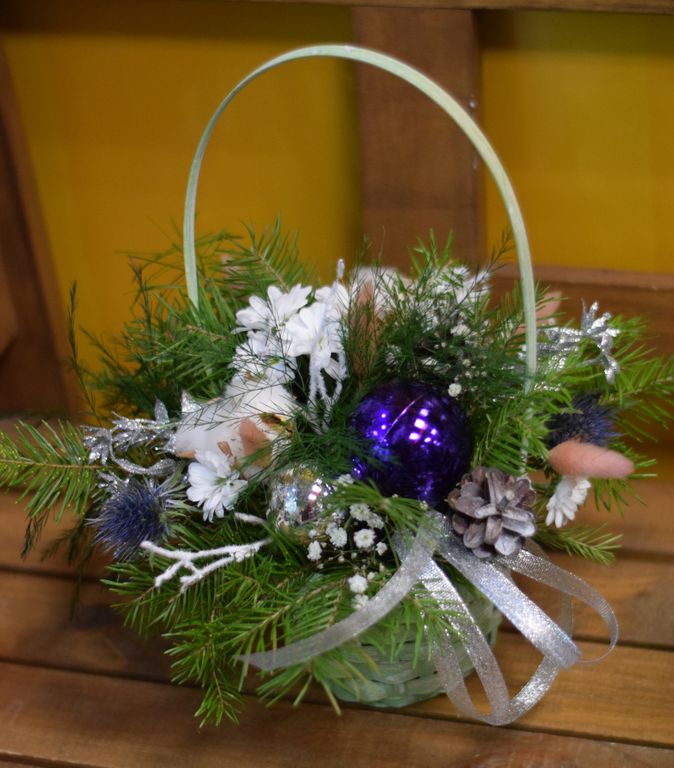 Композиция новогодняя - комплимент для коллеги 900 ₽ В корзину В корзину Состав композиции: шарики, хлопок, корзинка, пихта, сантини, хризантемы, шишки, декор. Состав композиции: шарики, хлопок, корзинка, пихта, сантини, хризантемы, шишки, декор. Поделиться С этим товаром покупаютКонфеты Раффаэлло 700 ₽В корзинуШоколадные конфеты Merci 700 ₽В корзину