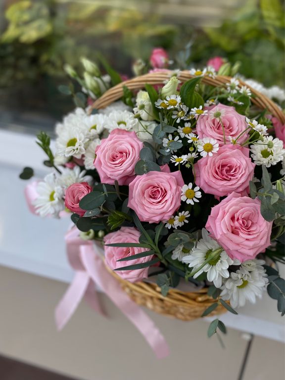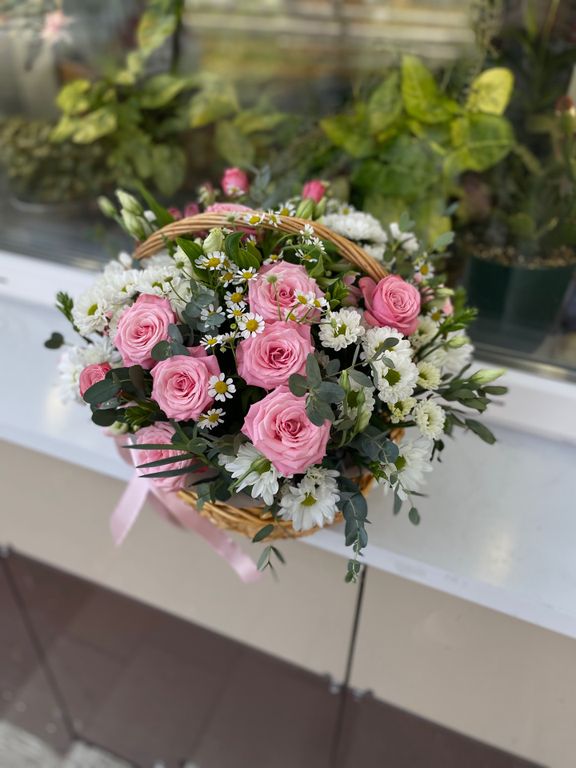 Композиция в корзинке 4 250 ₽ В корзину В корзину Кустовые розы, Эустома, Хризантема сантини, Матрикария, Эвкалипт, Оазис, Корзина. Кустовые розы, Эустома, Хризантема сантини, Матрикария, Эвкалипт, Оазис, Корзина. Поделиться