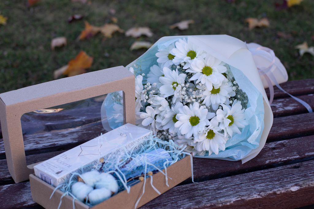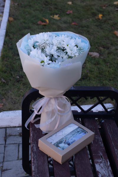 Набор "Букет и подарок" включает в себя букет хризентем с гипсофилой в стильной упаковке и крафтовую коробочку с сюрпризом.