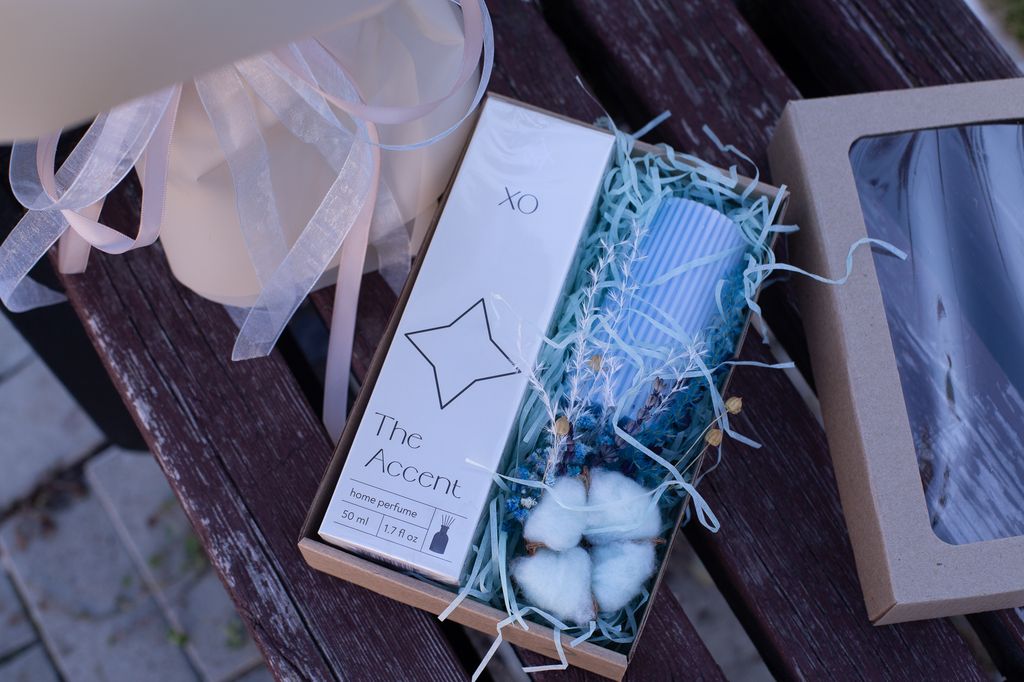 В состав подарка входит: аромадиффузор 50 ml, свеча и декор из сухоцветов.