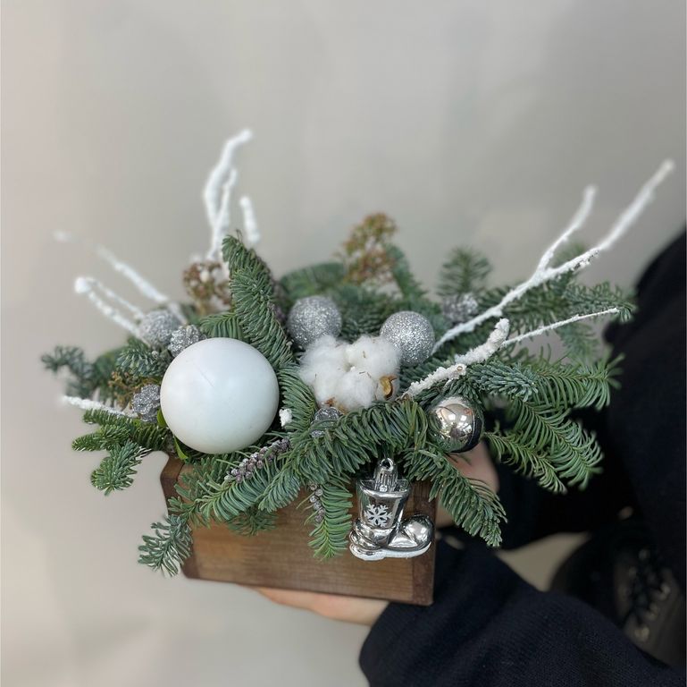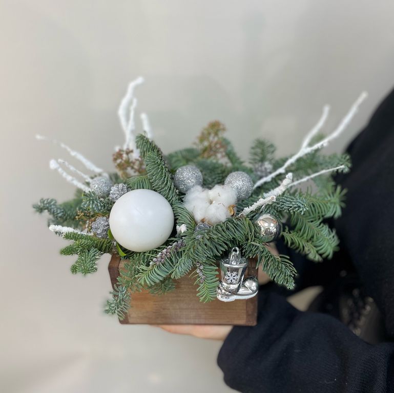 Зимняя композиция 1 250 ₽ В корзину В корзину Новогодняя композиция из нобилиса в деревянном ящичке с декором в бело-серебристой цветовой гамме. Декор может незначительно отличаться, но с сохранением общей концепции композиции. Новогодняя композиция из нобилиса в деревянном ящичке с декором в бело-серебристой цветовой гамме. Декор может незначительно отличаться, но с сохранением общей концепции композиции. Поделиться